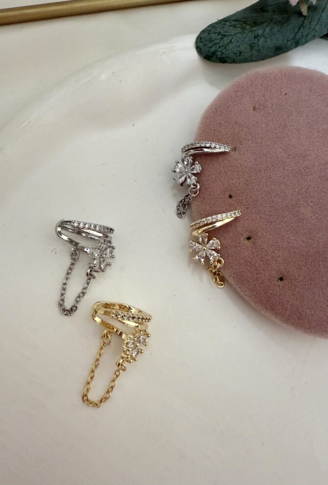Çift Sıra Zincirli Üzeri Çiçek Detay Kıkırdak Küpe