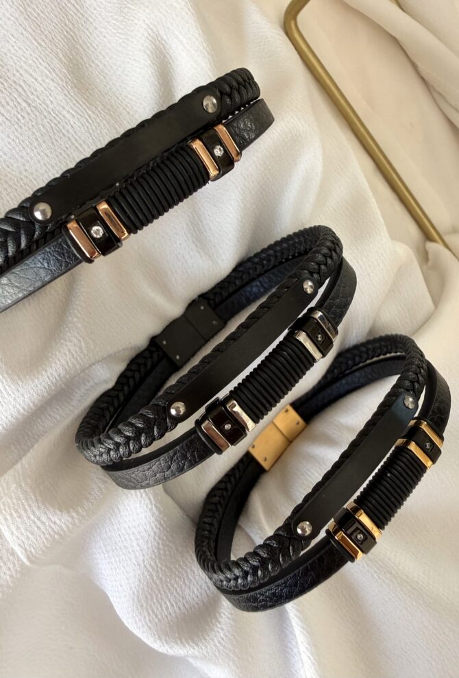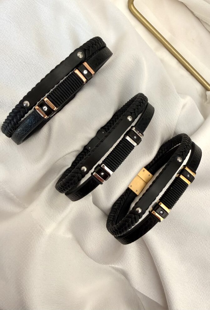 Plaka İnce Şerit 2 li Deri Çelik Erkek Bileklik