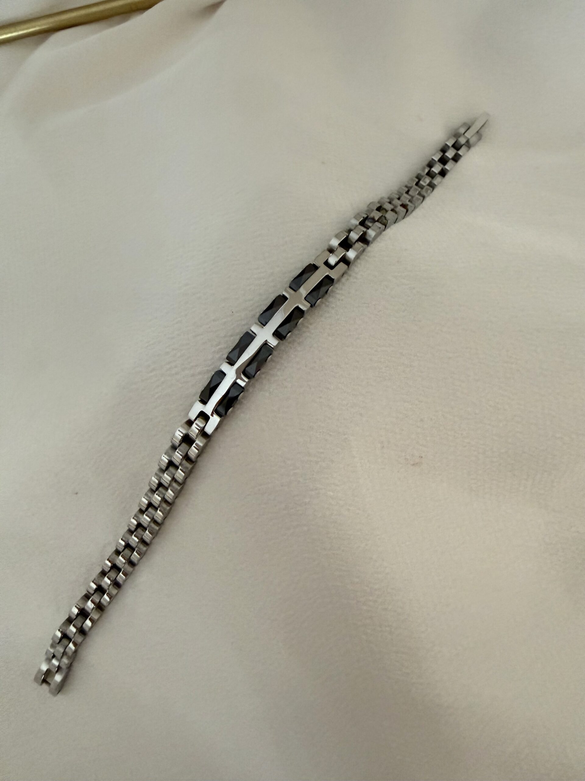 Çelik Ortası Siyah Desen Gümüş Erkek Bileklik