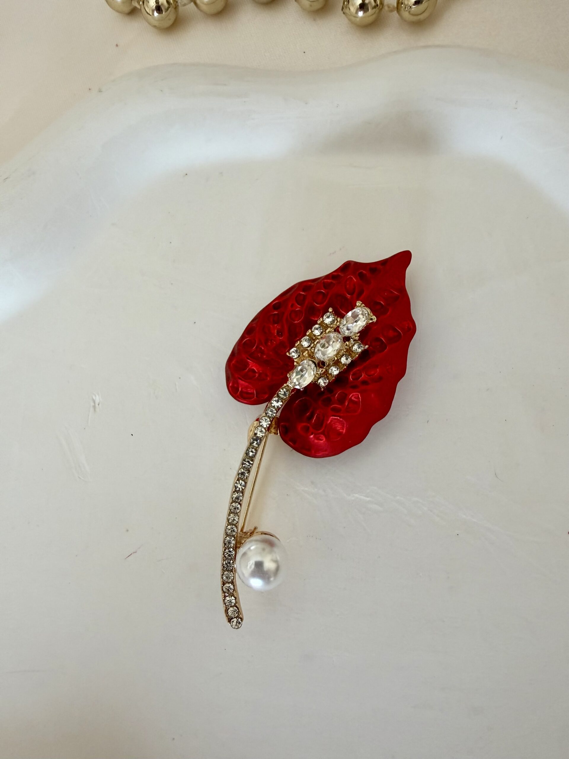 Kırmızı İnci Detay Gül Broş