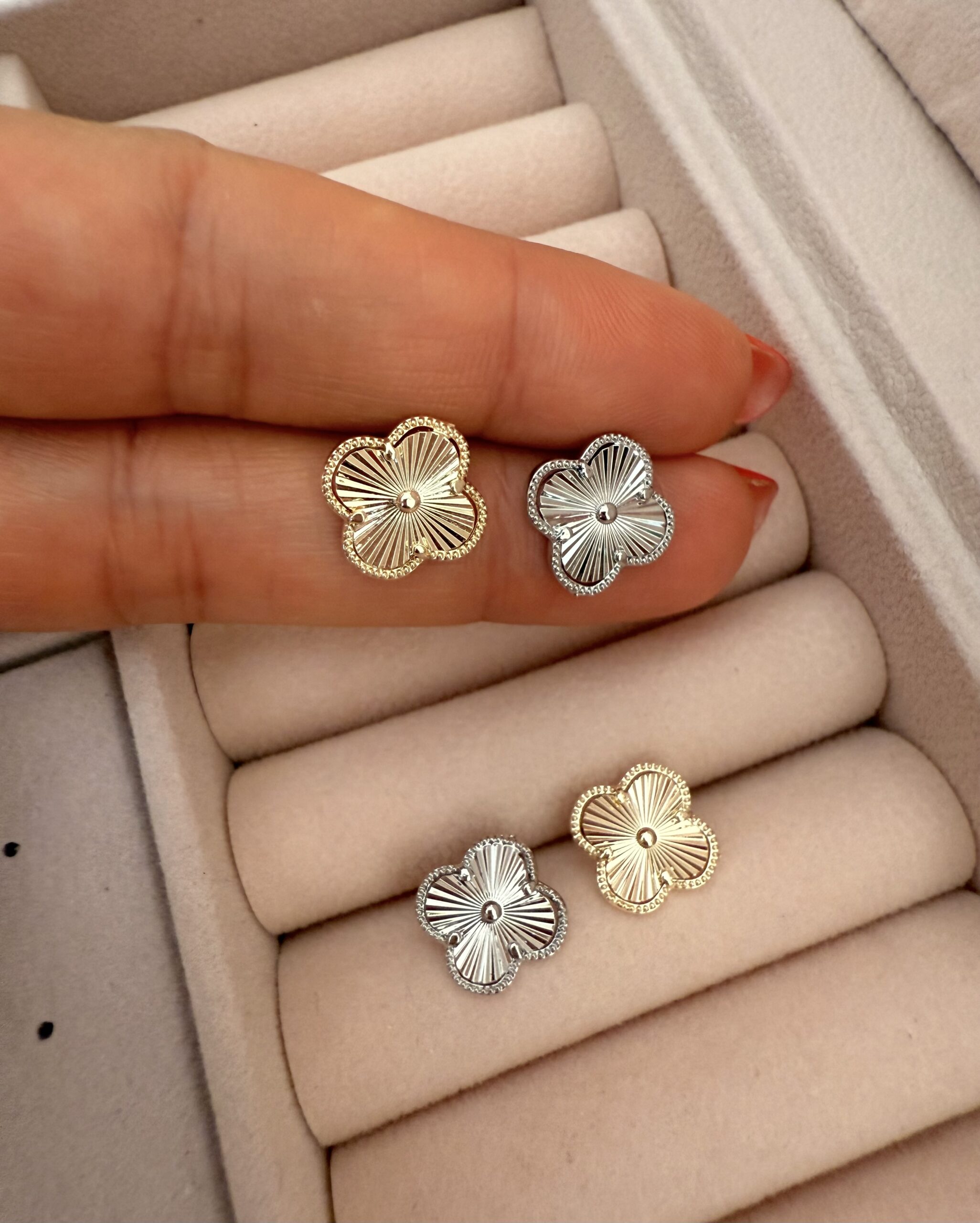 Lazer Çizgi Desen Mini Yonca Küpe