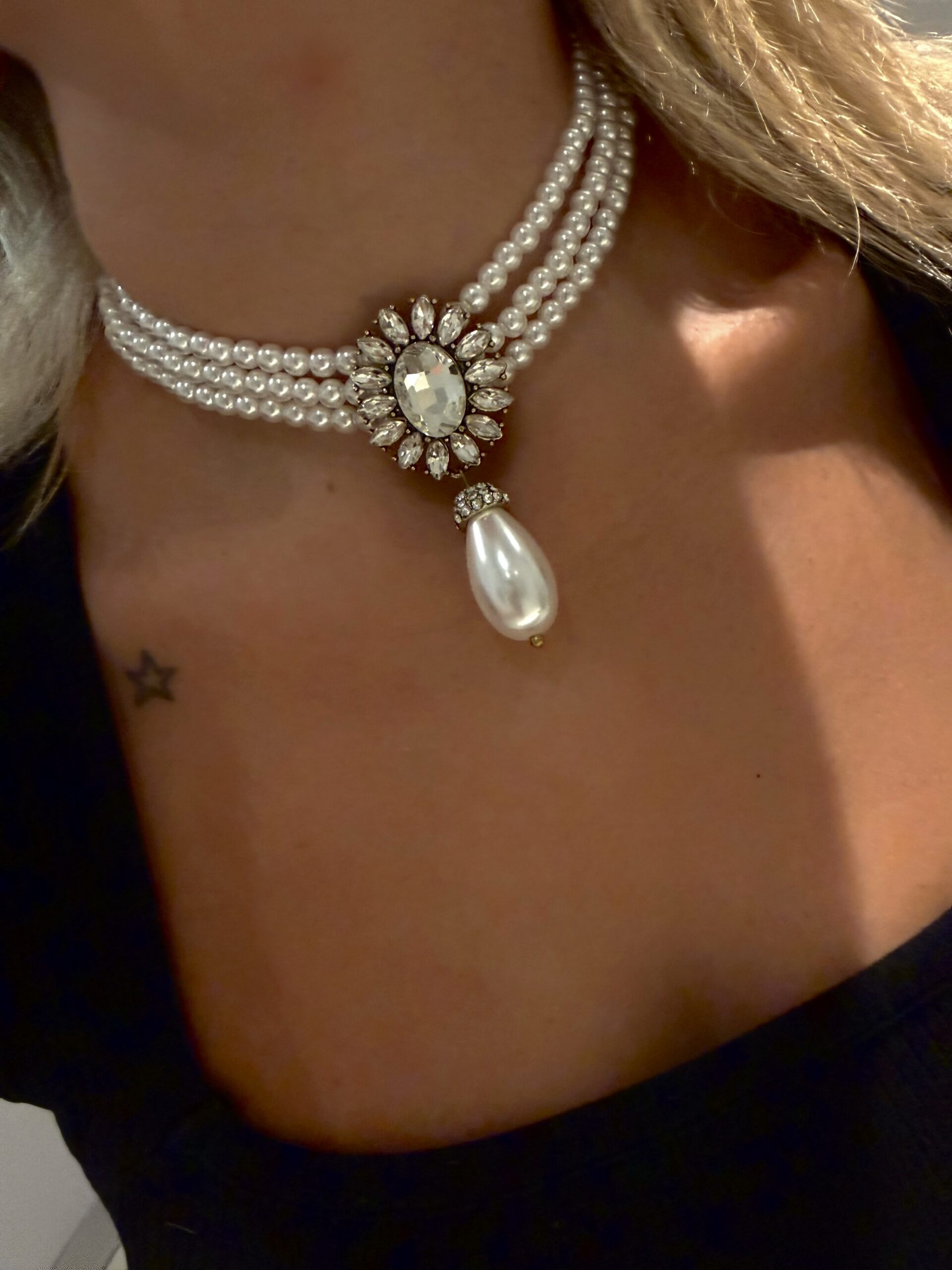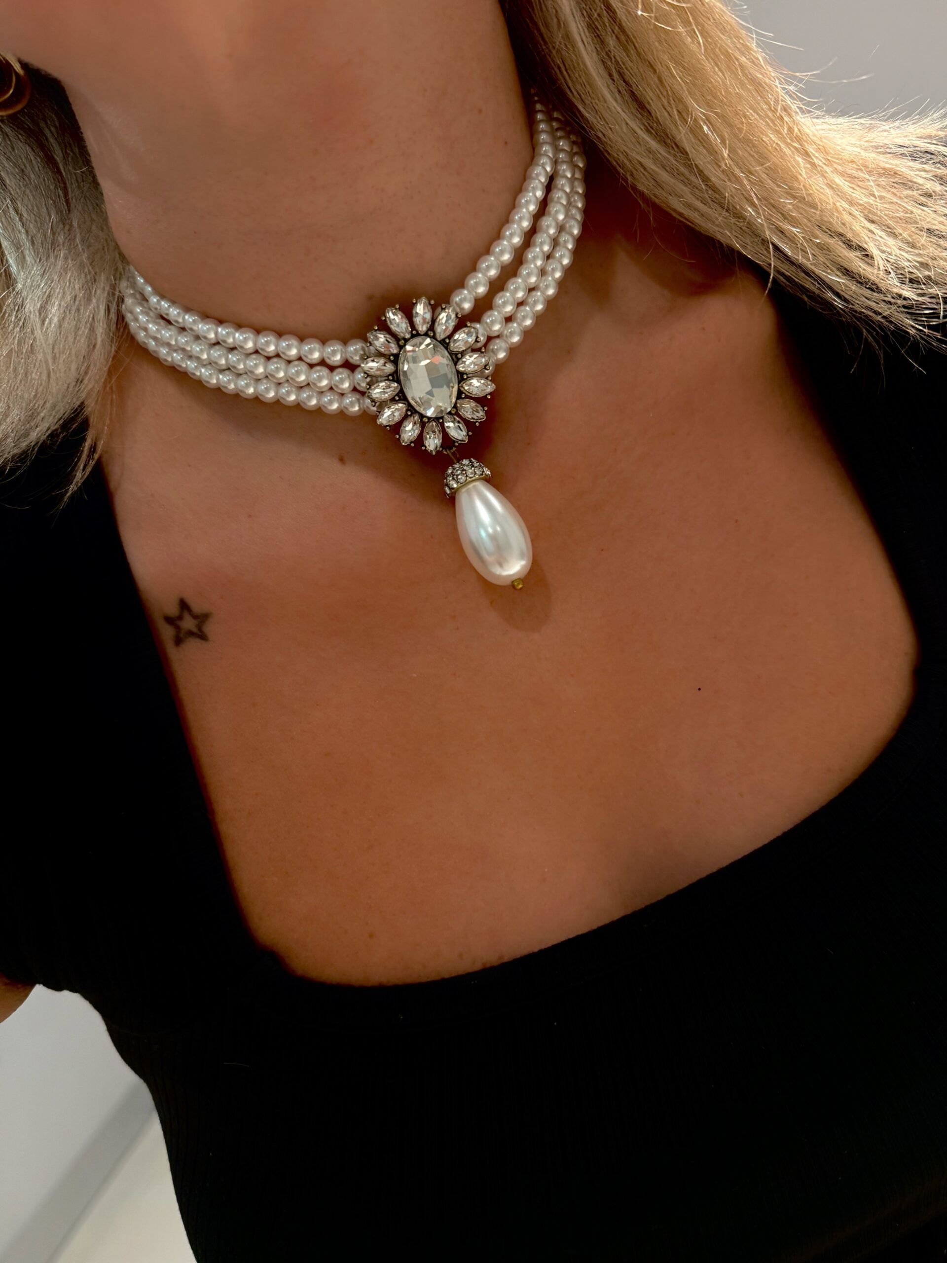 Ortası Kristal Taş 3 Sıra İnci Choker Kolye