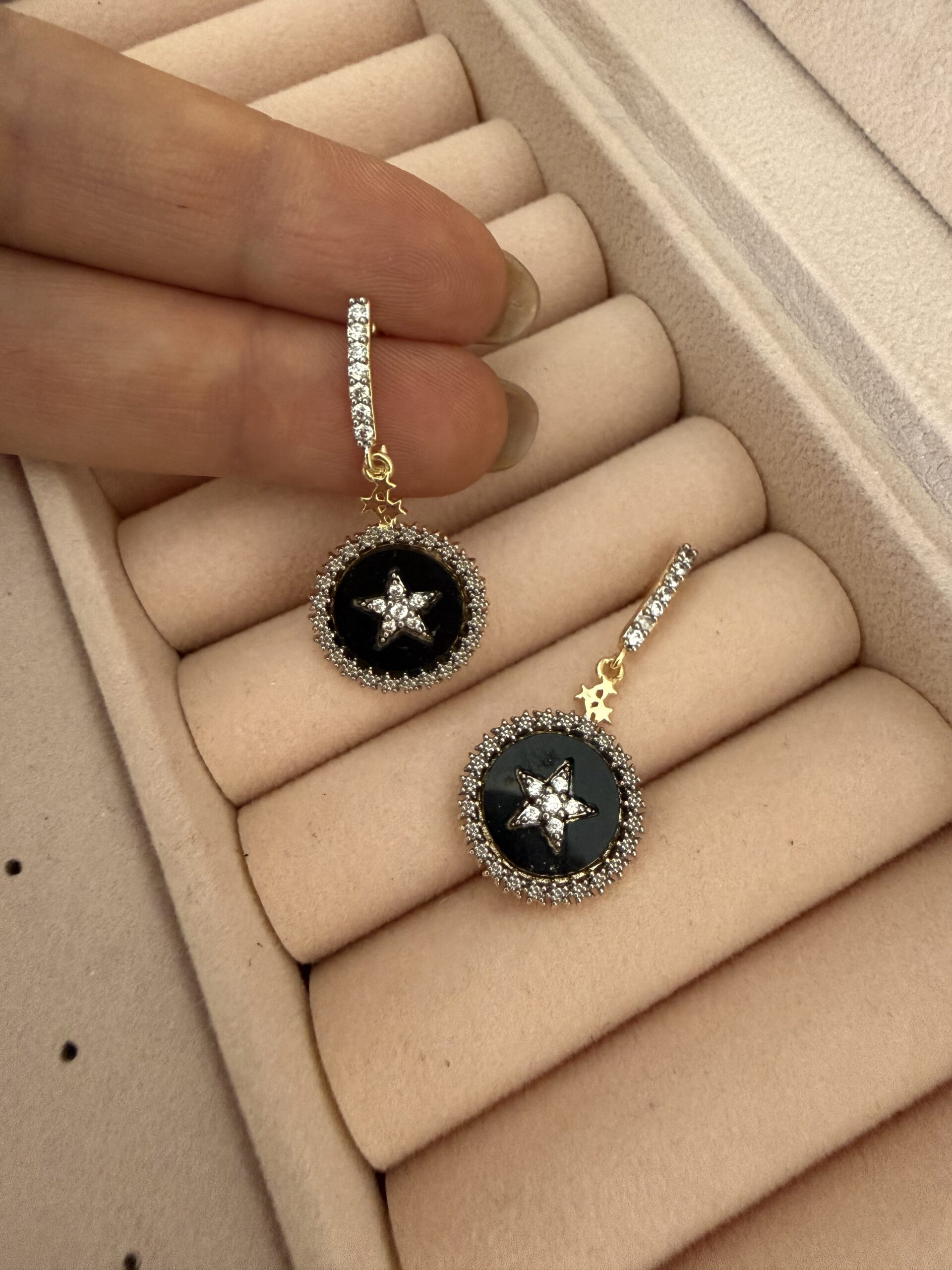 Siyah Mine Taşlı Daire Yıldız Küpe