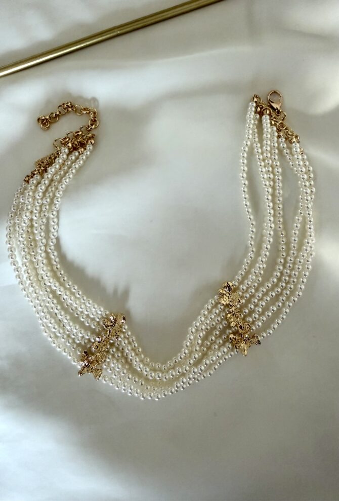 Gold Plaka Detay Yedi Sıra İnci Dizi Choker Kolye