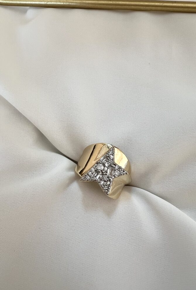 Gold Geniş Plaka Taşlı Yıldız Yüzük
