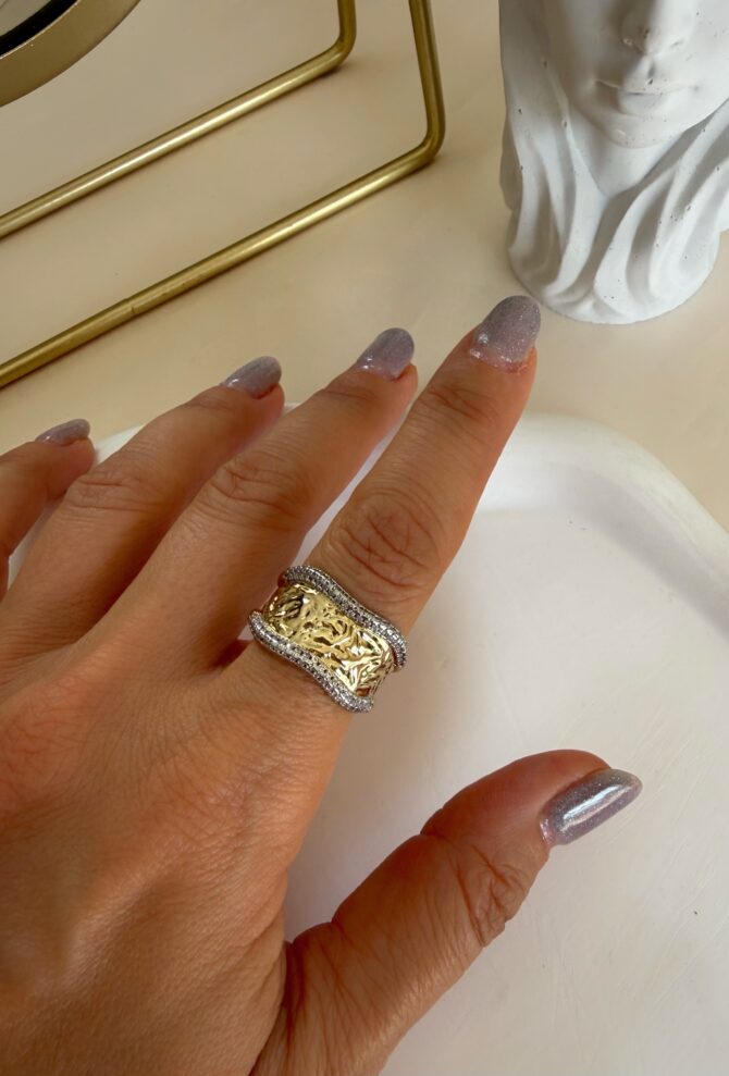 Tasarım Kalın Gümüş Plaka Üzeri Gold Detay Ayarlı Yüzük